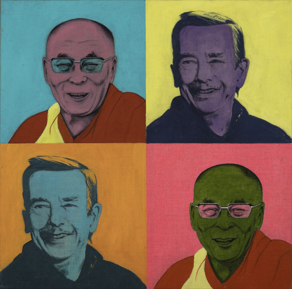 The painting “Friends” is a playful yet iconic tribute to two figures who shaped the spiritual and political ethos of the late 20th century – the Dalai Lama and Václav Havel. Zuzana Veselá places them in the visual language of Andy Warhol: repetition, rich contrasting colors, a matrix of four squares. Each of the men is depicted twice, in slightly different color combinations, creating the effect of a pop art poster, where spirituality and politics are transformed into cultural icons.